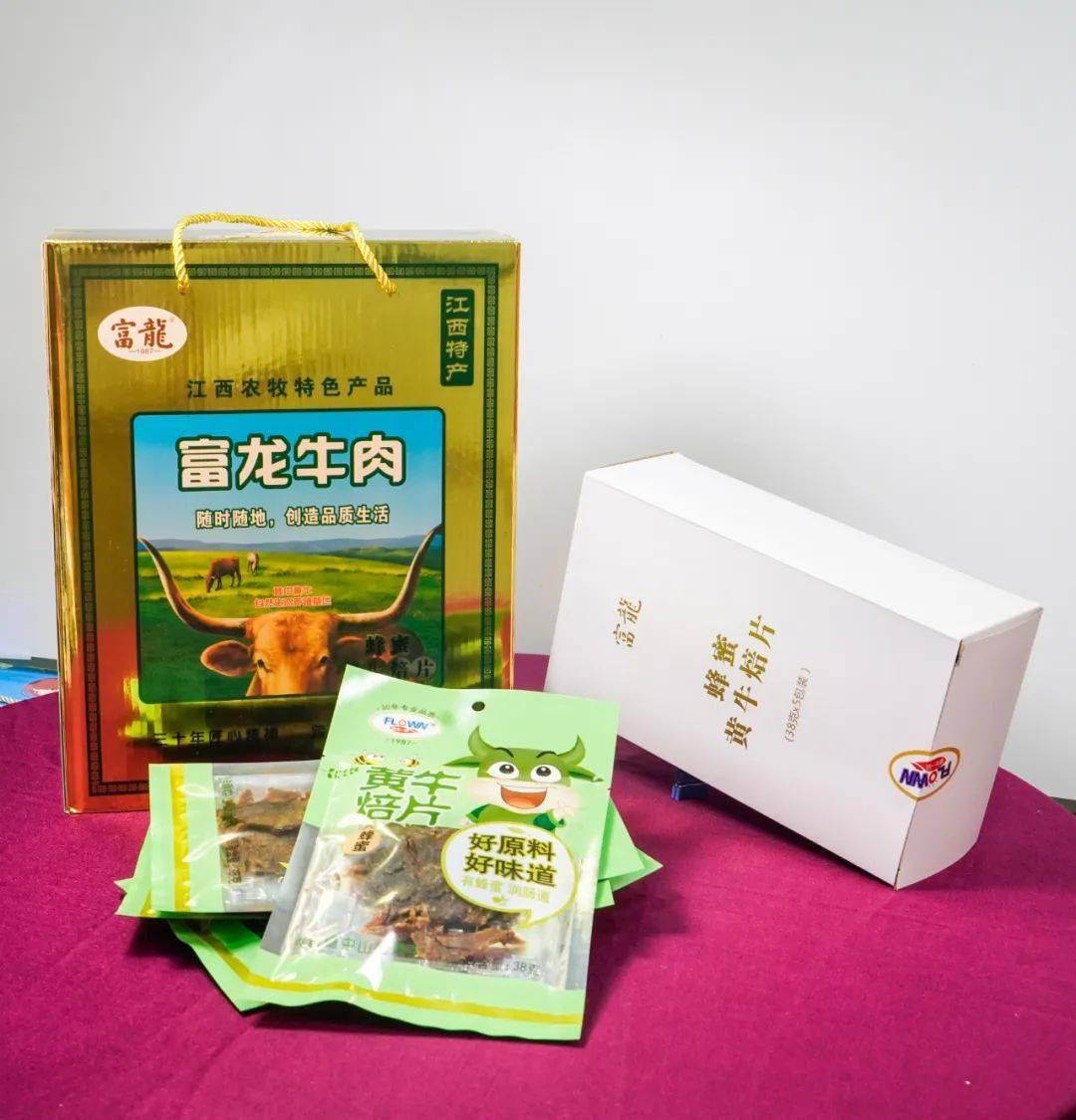 富龙牛肉干,通常精选健康新鲜牛后腿肉(俗称“米龙”),肉色鲜红,纹理清晰,脂肪和筋膜相对较少,肉嫩且有弹性。配以生姜、辣椒、肉桂、丁香等十多味天然香料精制而成,具有江西特色的风味。