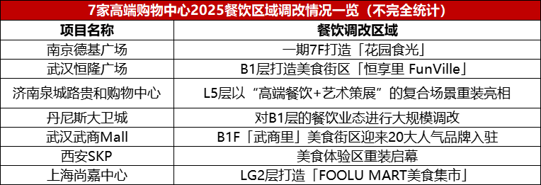 在存量时代下,众多购物中心正通过自主调改来提升消费体验,以保持市场竞争力。从市场表现来看,无论是高端购物中心还是大众型购物中心,餐饮区域的优化都已成为调改的重点。据铱星云商不完全统计,今年以来,至少已有13家购物中心对餐饮区域进行了不同程度的调整。
