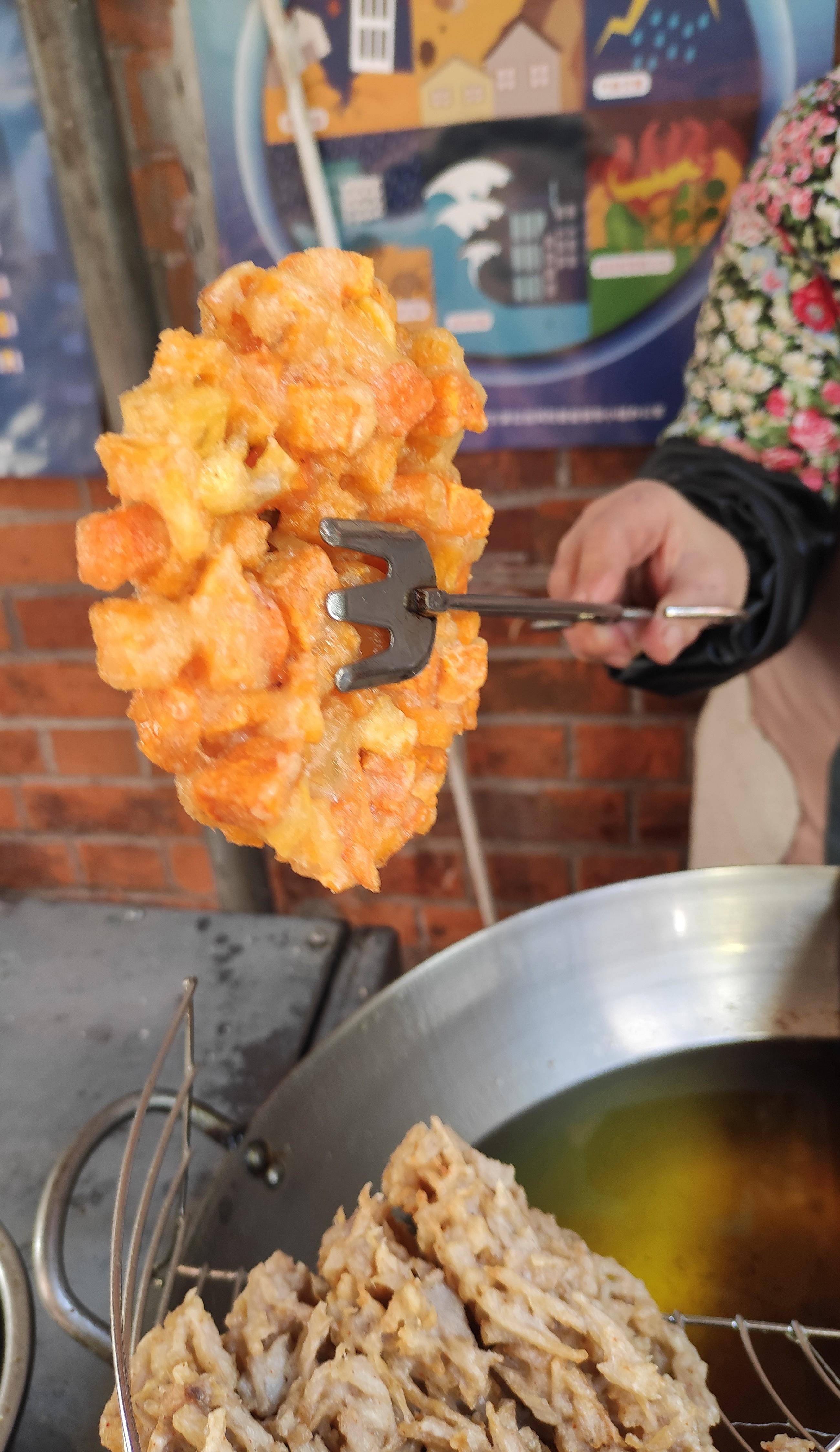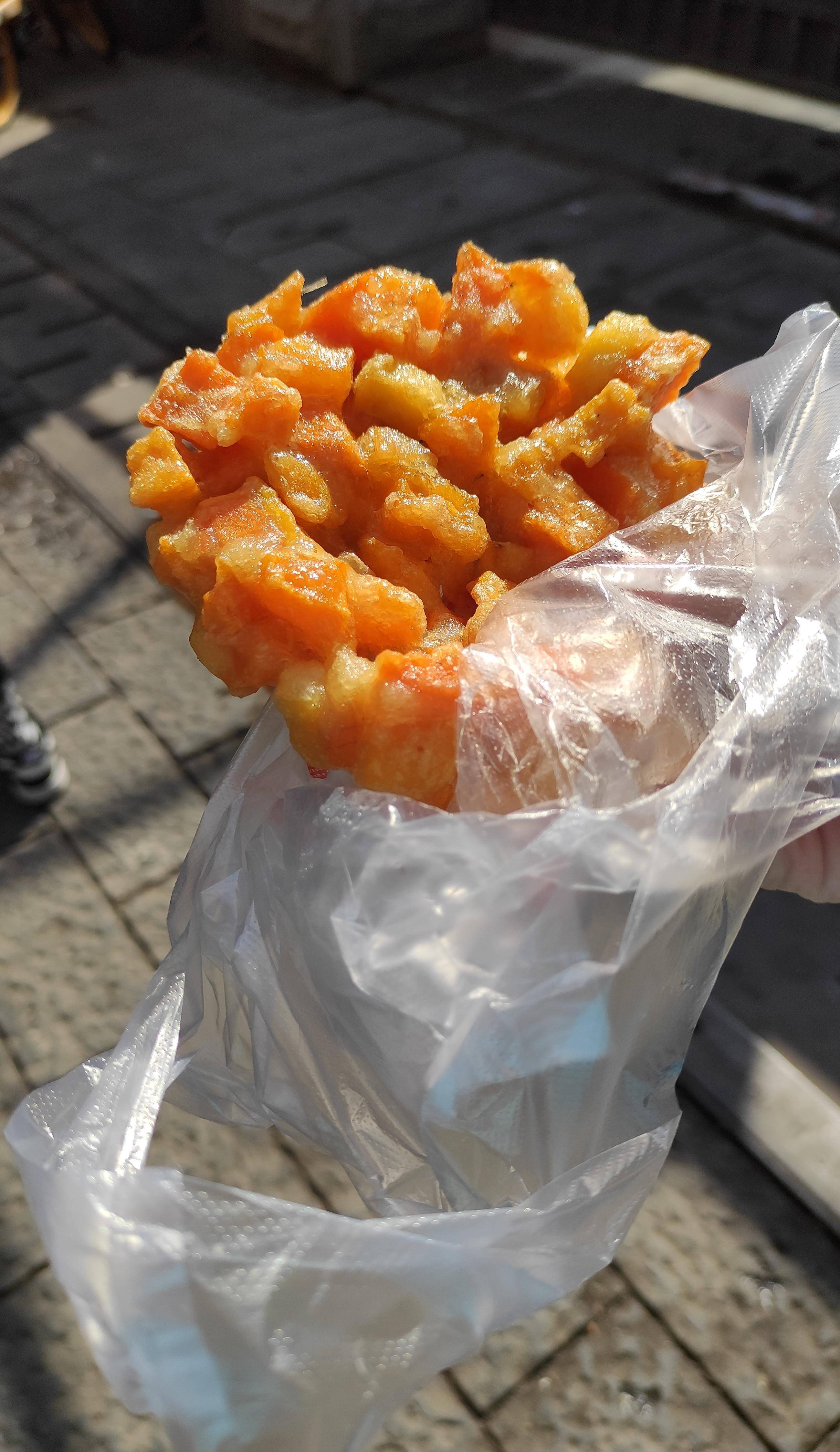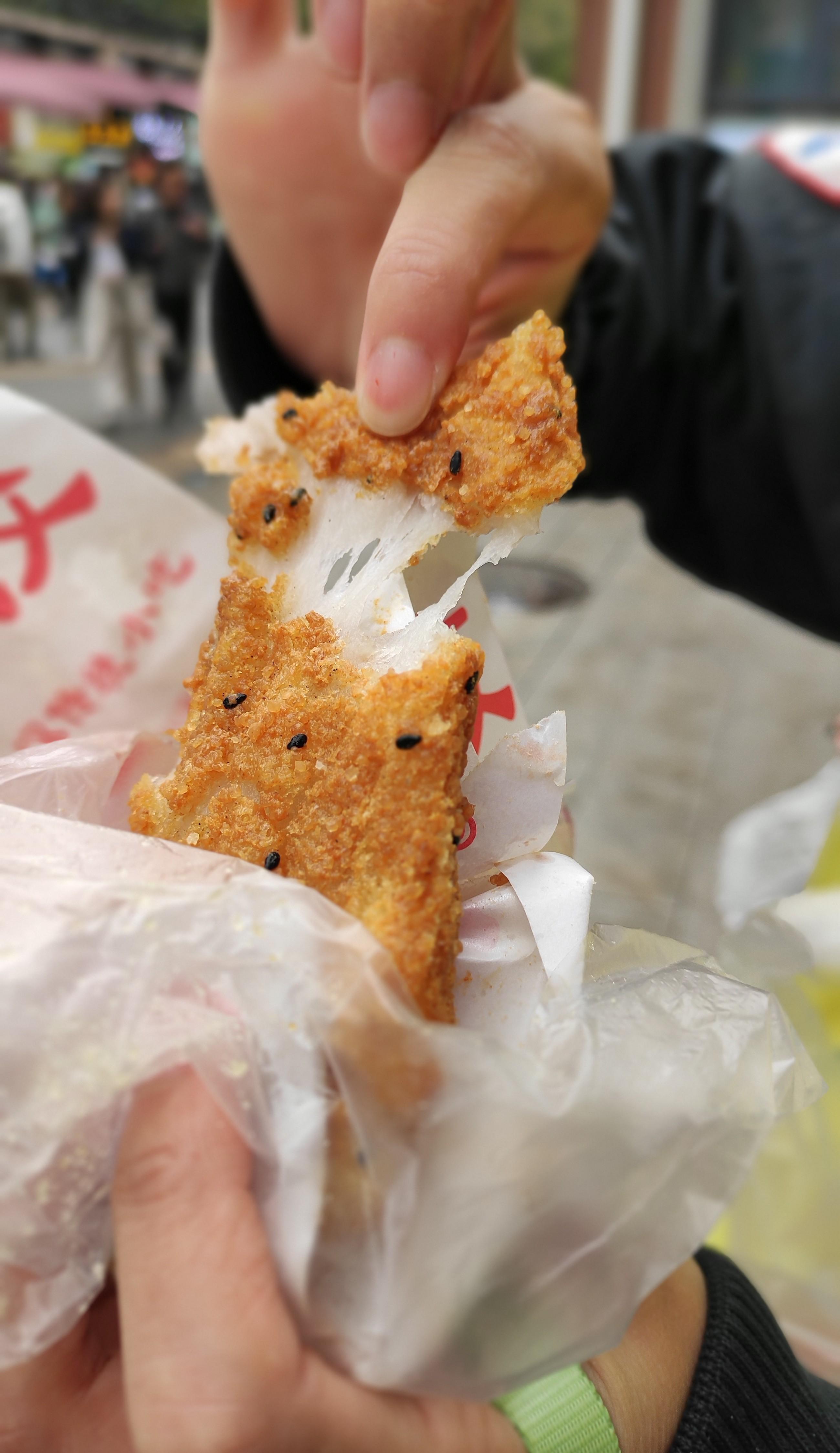外皮非常的酥脆,裹了一层糖霜,也就是我们刚刚说的白色糖霜,像糍粑但比糍粑酥脆,外形像油条,但又比油条糯;