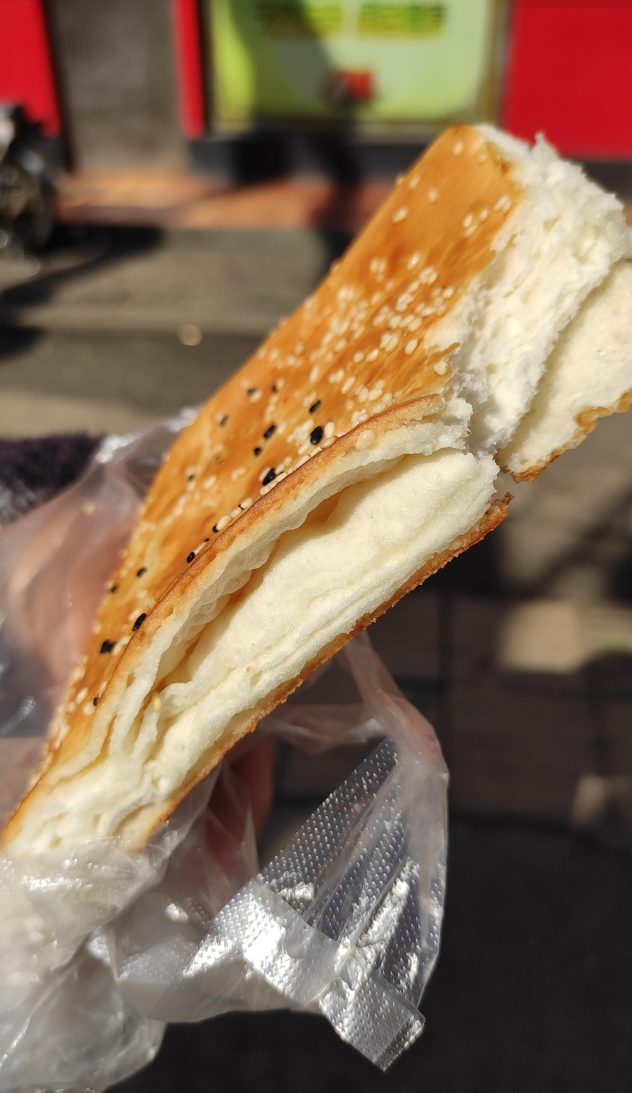 先说说这种剁馍的口感,焦甜味,外皮比较脆,内里软软的,好像有奶油馅,但是吃了几口之后,奶油味浓郁,但确实是没有馅的,很有嚼劲,类似于烧饼,但没有烧饼硬,比我们小的时候吃的那种火烧馍,口感更好,这种新式的剁馍,可能是用油煎或者烤出来的;