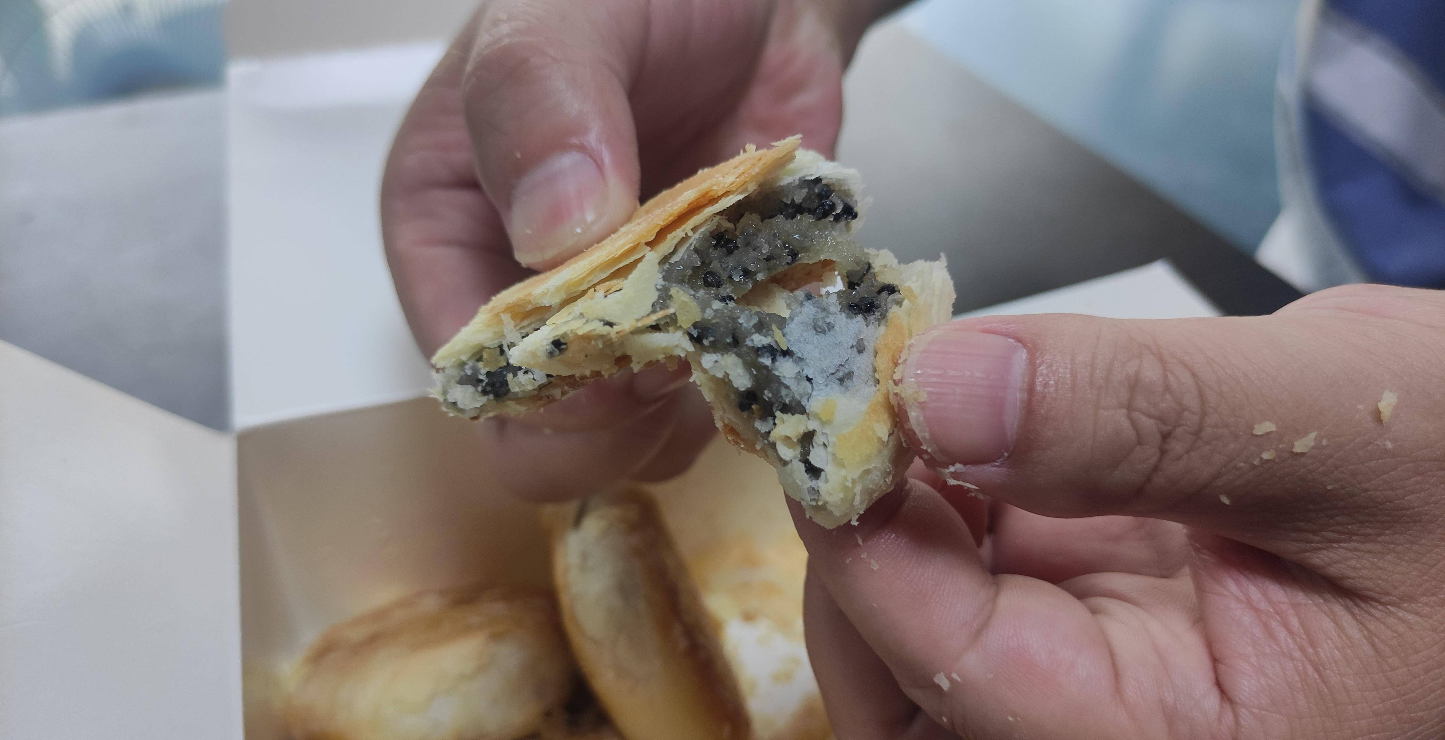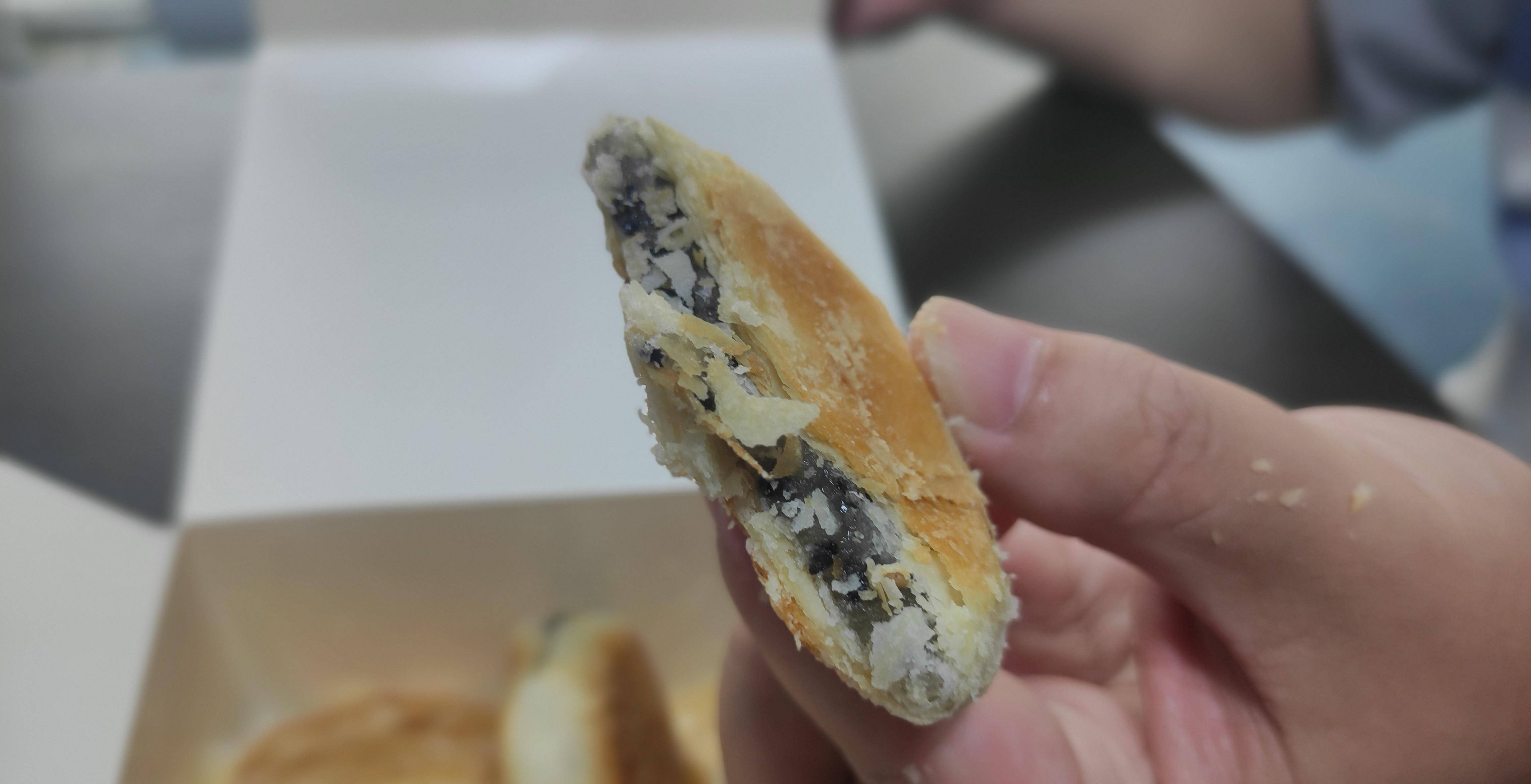 桂花味的馅饼,算是我喜欢的口味,桂花味浓郁,我感觉还是蛮甜的,馅料十足,如果能够适当降低一点点甜度会更好,椒盐味道的,是我最喜欢,甜咸口的,好像是他屋里唯一的咸口,吃了甜味十足的桂花味馅饼,再来一个椒盐味的,综合之后的口感是最奇妙的,这也是我最喜欢的搭配方式;