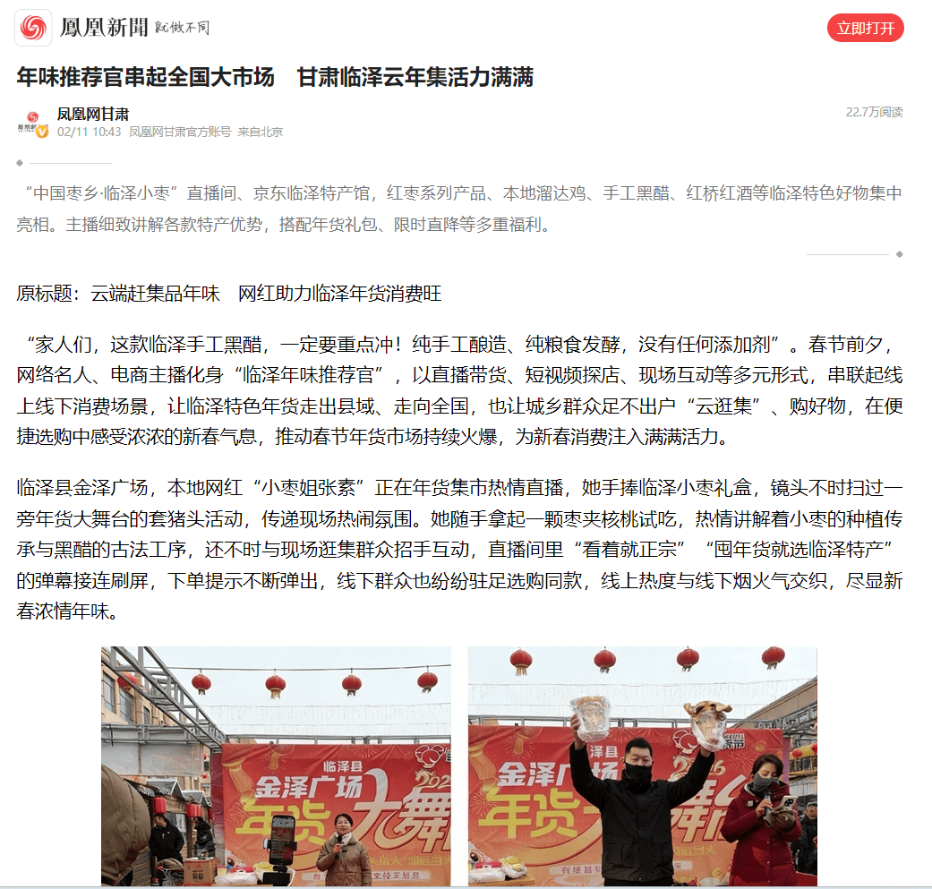 在临泽,类似这样云端赶集的消费形式还有很多。数据显示,今年春节前夕,当地网红年货直播专场累计观看人次突破50万人次,物流快递量同比增长20%,生动彰显出临泽新春消费市场的强劲活力。网络带货不仅让年货消费更便捷,更让临泽的年味文化通过云端传递,让这个春节,无论相隔多远,都能品味到浓浓的临泽味。(临泽县委宣传部李艳)(临泽县人民政府官网)