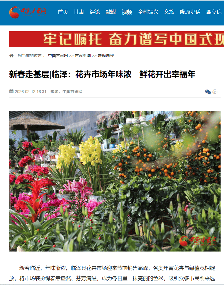 据临泽县旭君花卉苗木公司负责人陈吉超介绍:“临近春节,前来选购鲜花的顾客很多,花卉销量持续走高,金桔、大花蕙兰、杜鹃花、造型黄杨、百合竹、娃娃蕉等寓意吉祥、色彩鲜艳的年宵花卉已经大量到货。不少市民趁着节前前来挑选,大家都偏爱花色艳丽、寓意美好的花卉,为家里增添浓浓的年味。”