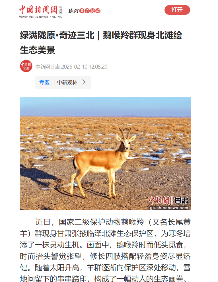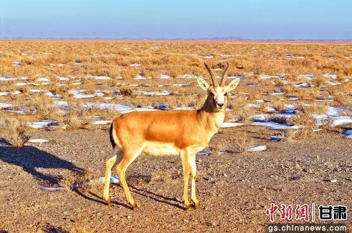 近日,国家二级保护动物鹅喉羚(又名长尾黄羊)群现身甘肃张掖临泽北滩生态保护区,为寒冬增添了一抹灵动生机。画面中,鹅喉羚时而低头觅食,时而抬头警觉张望,修长四肢搭配轻盈身姿尽显矫健。随着太阳升高,羊群逐渐向保护区深处移动,雪地间留下的串串蹄印,构成了一幅动人的生态画卷。(程莉 田育明)