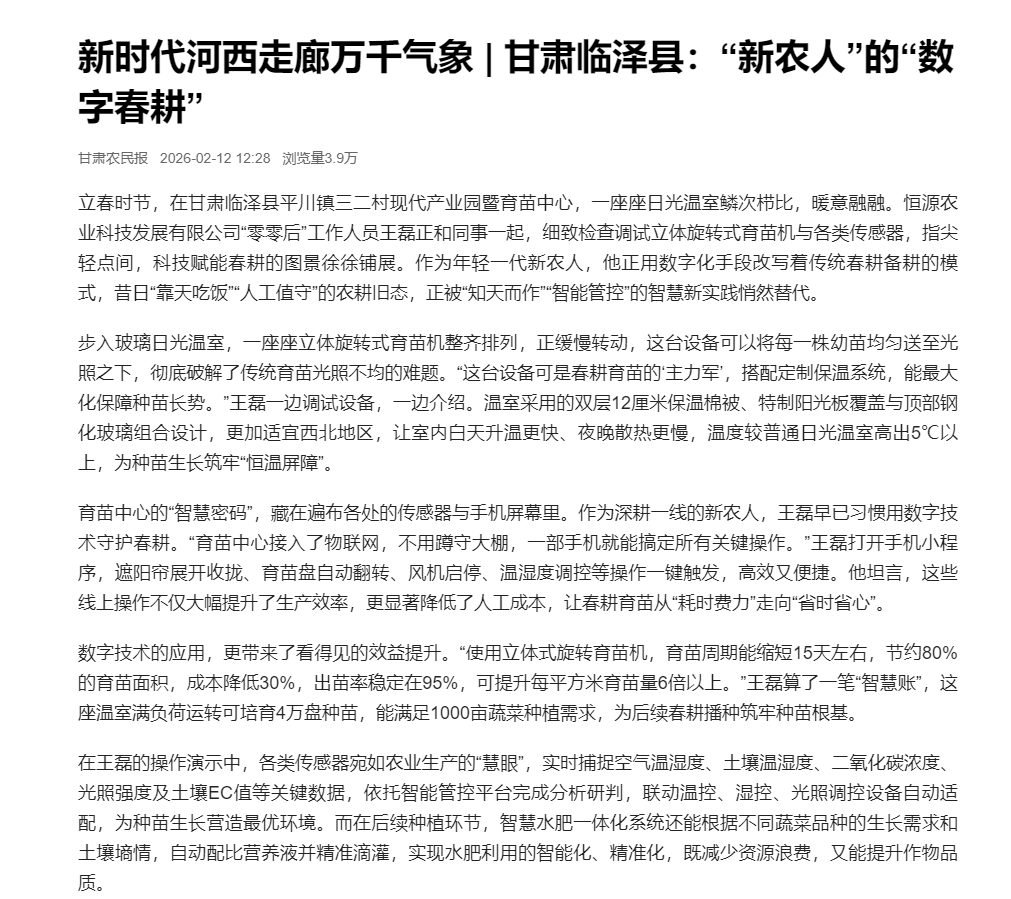 立春时节,在甘肃临泽县平川镇三二村现代产业园暨育苗中心,一座座日光温室鳞次栉比,暖意融融。恒源农业科技发展有限公司“零零后”工作人员王磊正和同事一起,细致检查调试立体旋转式育苗机与各类传感器,指尖轻点间,科技赋能春耕的图景徐徐铺展。作为年轻一代新农人,他正用数字化手段改写着传统春耕备耕的模式,昔日“靠天吃饭”“人工值守”的农耕旧态,正被“知天而作”“智能管控”的智慧新实践悄然替代。