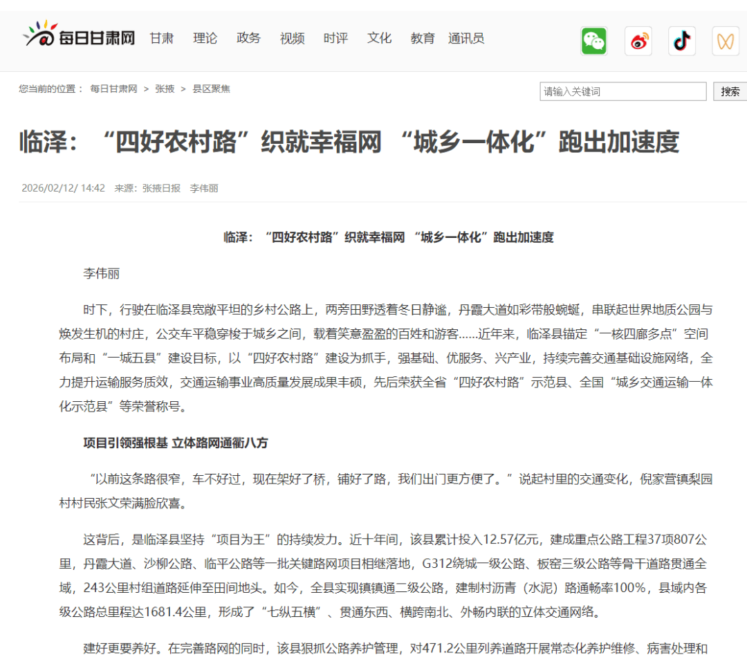 路网通,百业兴。临泽县将持续巩固交通运输发展成果,不断完善交通基础设施,提升运输服务水平,以更优质的交通保障助力县域经济社会高质量发展,让群众在交通发展中收获更多幸福感。