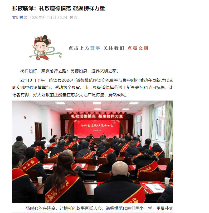 2月10日上午,临泽县2026年道德模范座谈交流暨春节集中慰问活动在县新时代文明实践中心温情举行。活动为全县省、市、县级道德模范送上新春关怀和节日祝福,让德者有得、好人好报的正能量在枣乡大地广泛传递、蔚然成风。