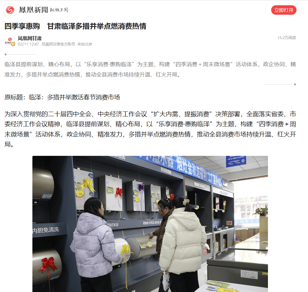 县上紧扣节庆节点,聚焦大宗消费、服务消费、新型消费等重点领域,坚持政府搭台、企业唱戏、群众受益,政企联动推出一系列惠民利民促消费举措,实现多领域、多层次、多元化促消费全覆盖。活动涵盖电子消费券发放、家电以旧换新、购车补油卡、主题促销、直播带货、特色展销等多元形式,深度融合新春年货、特色美食、家电焕新、汽车惠民、电商助农等消费场景,线上线下同步发力、商文旅体深度融合,让群众享实惠、商家添活力、市场增热度。活动期间,全县各大商超、家电卖场、汽车经销商、餐饮门店同步响应,年货琳琅满目、优惠力度加码,直播带货拓宽农特产品销路,特色展销点亮城乡消费场景。电子消费券精准直达,以旧换新便捷高效,购车补贴实实在在,有效释放居民消费潜力,营造出热闹喜庆、安全有序的节日消费氛围。(赵棠)(临泽县人民政府官网)
