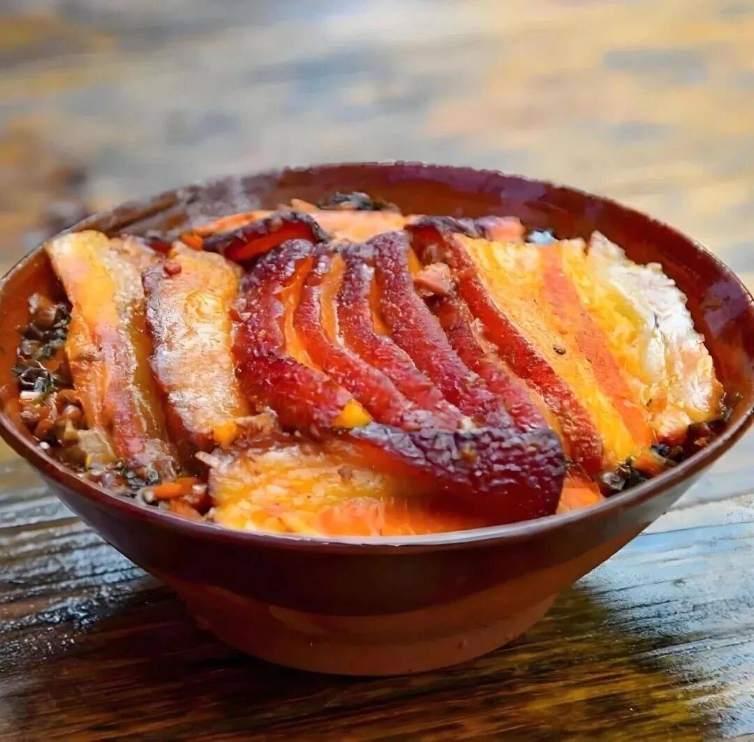 选五花三层的“三线肉”,先炸后蒸,让猪皮起皱吸饱酱汁。底下垫的芽菜或盐菜,是解腻的灵魂。