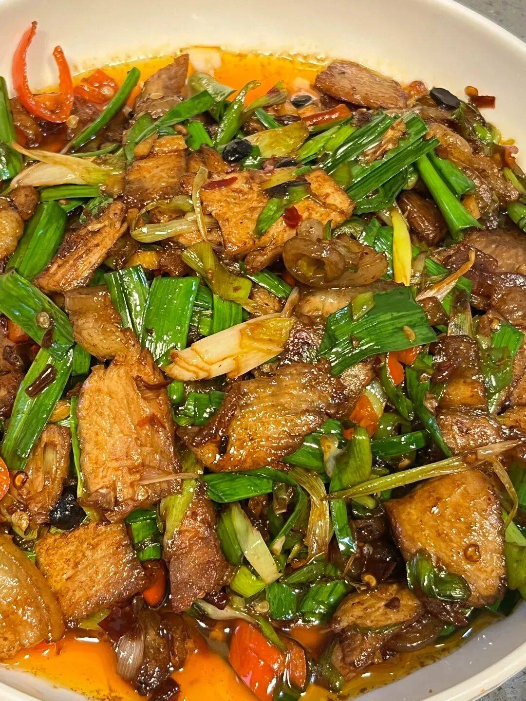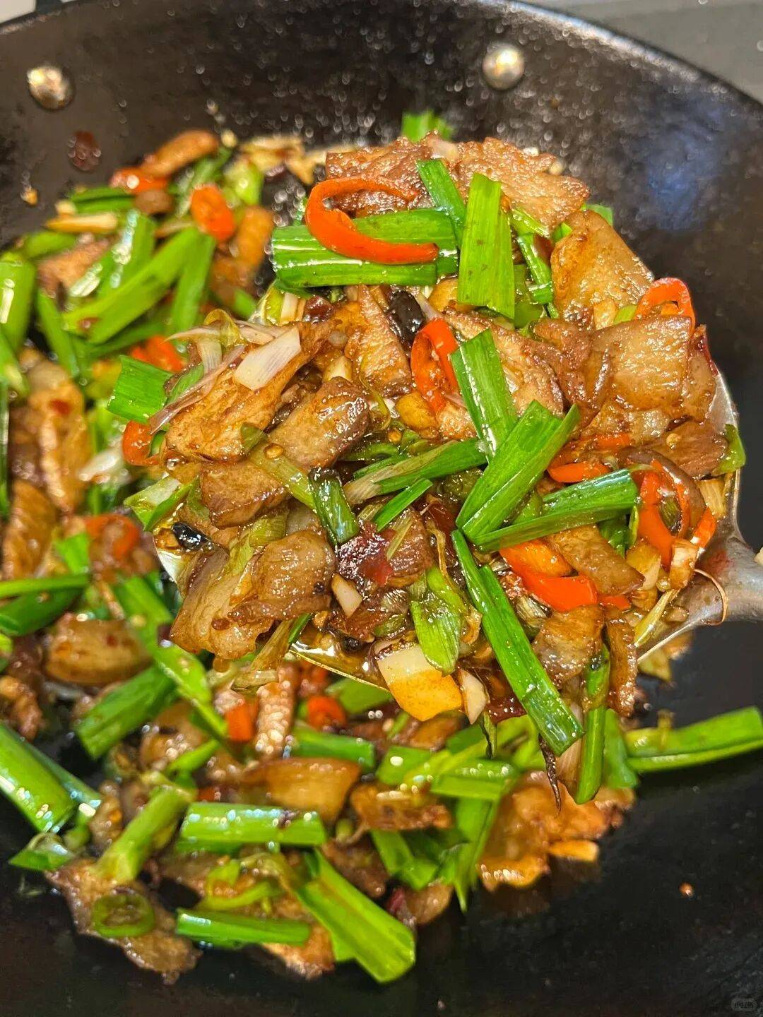 带皮五花肉煮到七分熟,切片下锅煸出油花,再和蒜苗、青椒、豆瓣酱一起大火翻滚。