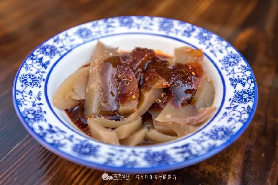 荞粉,一种看似很像凉粉的小吃。色土黄,味苦,也许除了陇西本地的人儿,外地的人们都不喜欢吃吧,荞粉,切成薄片,放上慢慢一勺辣椒油,及蒜蓉加醋,味道回味无穷。