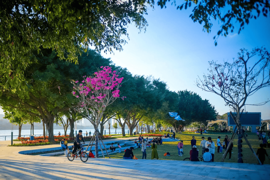 主要特色:海明公园位于东海岸新城塔岗围片区,沿着主河涌而建,是一个以滨水生态为特色的带状公园。该公园毗邻汕头大学东校区,优美的环境吸引了众多市民前来散步运动和野餐露营,也是汕头最佳的落日观赏点之一。海明公园沿河打造“步行+自行车”亲水慢行系统,串联园内不同的景观空间。其中设计有塔岗观澜、碧波竞渡、青春逐梦、青春剧场等景观节点和运动纪念园,展现青春活力、文化交融的体育运动精神。在公园内河涌西岸,建设有以龙舟文化为主题的龙舟广场,具备龙舟观赛、展示等功能。